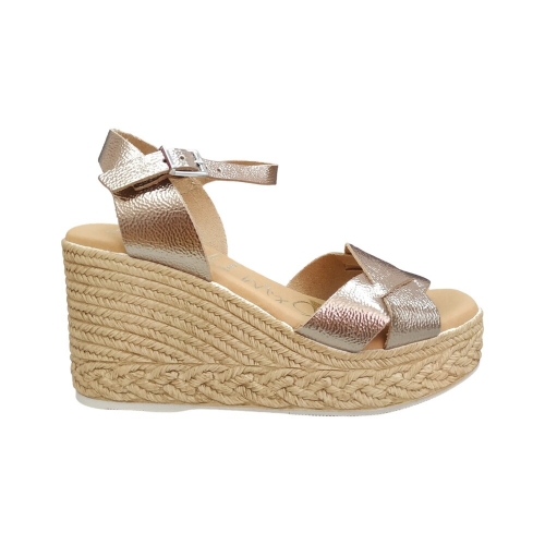 Sandalia de mujer fabricada en piel de color cava. El modelo se caracteriza por el diseño de su pala con tiras entrelazadas y el suave grabado en la piel. Talón con cierre de hebilla. Detalle de trenza en la suela. Cómodas por su planta acolchada, ideales para el día a día.