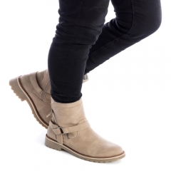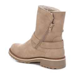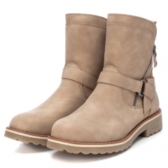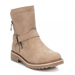 Botín de mujer, de la marca Refresh. Fabricado en material que imita la piel. Forro de borreguito ideal para los días más frios. Cierre mediante cremallera. Correa al tobillo con aro metálico y cremallera lateral decorativa. Suela dentada de goma antideslizante. Te lo querrás poner todos los días. Este modelo ha obtenido el certificado vegano por la organización mundial PETA (Organización de los derechos de los animales).