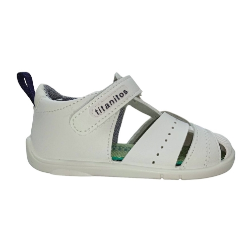 Sandalia en color blanco en piel lavable en lavadora. Cierre en velcro con el logo de la marca. ¡Los pies de los pequeñitos merecen lo mejor! Y con este modelo de la línea Bioelastic de Titanitos, ¡lo tienen! Estas sandalias no solo son súper chulas, ¡también tienen un piso súper blandito y flexible para cuidar cada pisada que dé tu bebé! cuentan con Bubble Absorber, Sistema Movelastic y Suela Soft para una mayor comodidad y seguridad en cada paso. Además, incluyen plantillas extraíbles, perfumadas y antibacterianas.