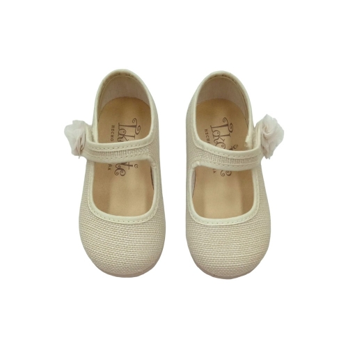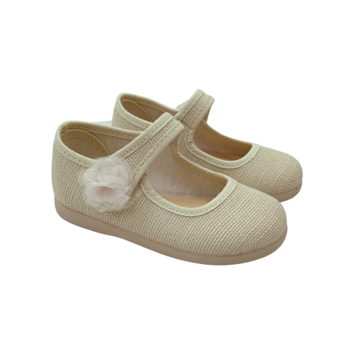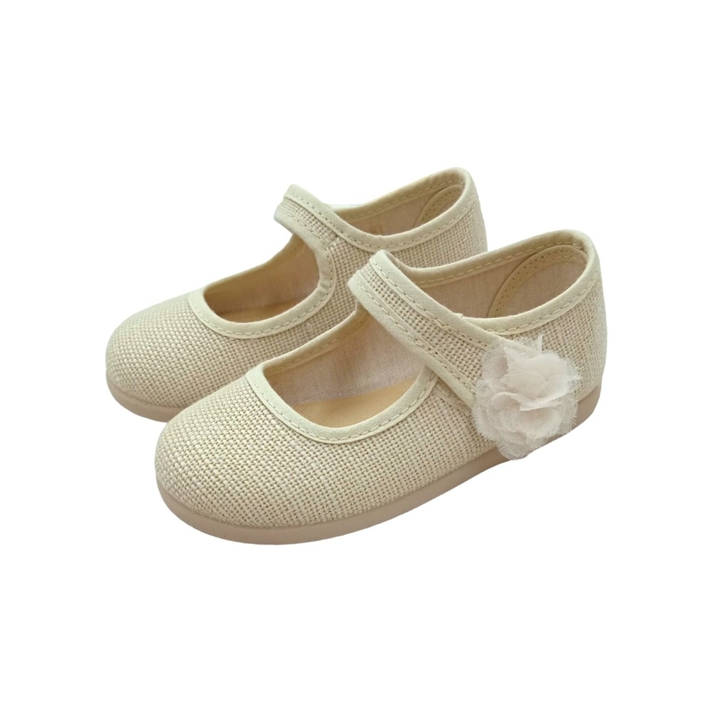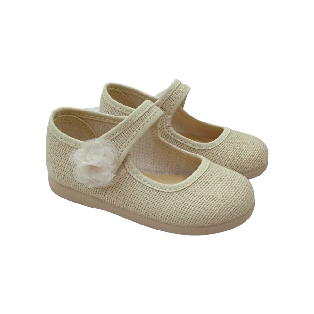 Mercedita en tejido color beig imitación al lino. Cierre en velcro con detalle de florecita a juego con el color del zapato que la hace ideal para eventos y ceremonias. Suela flexible y al tono.