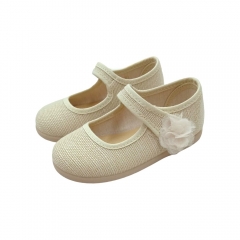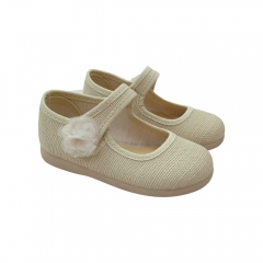 Mercedita en tejido color salvia imitación al lino. Cierre en velcro con detalle de florecita a juego con el color del zapato que la hace ideal para eventos y ceremonias. Suela flexible y al tono.