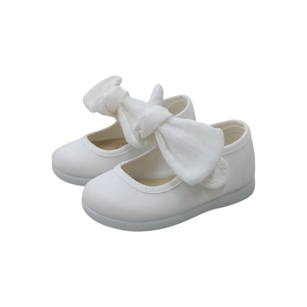 Merceditas en lona color rojo con lazo decorativo y cierre de velcro.