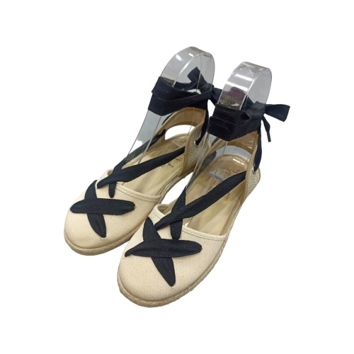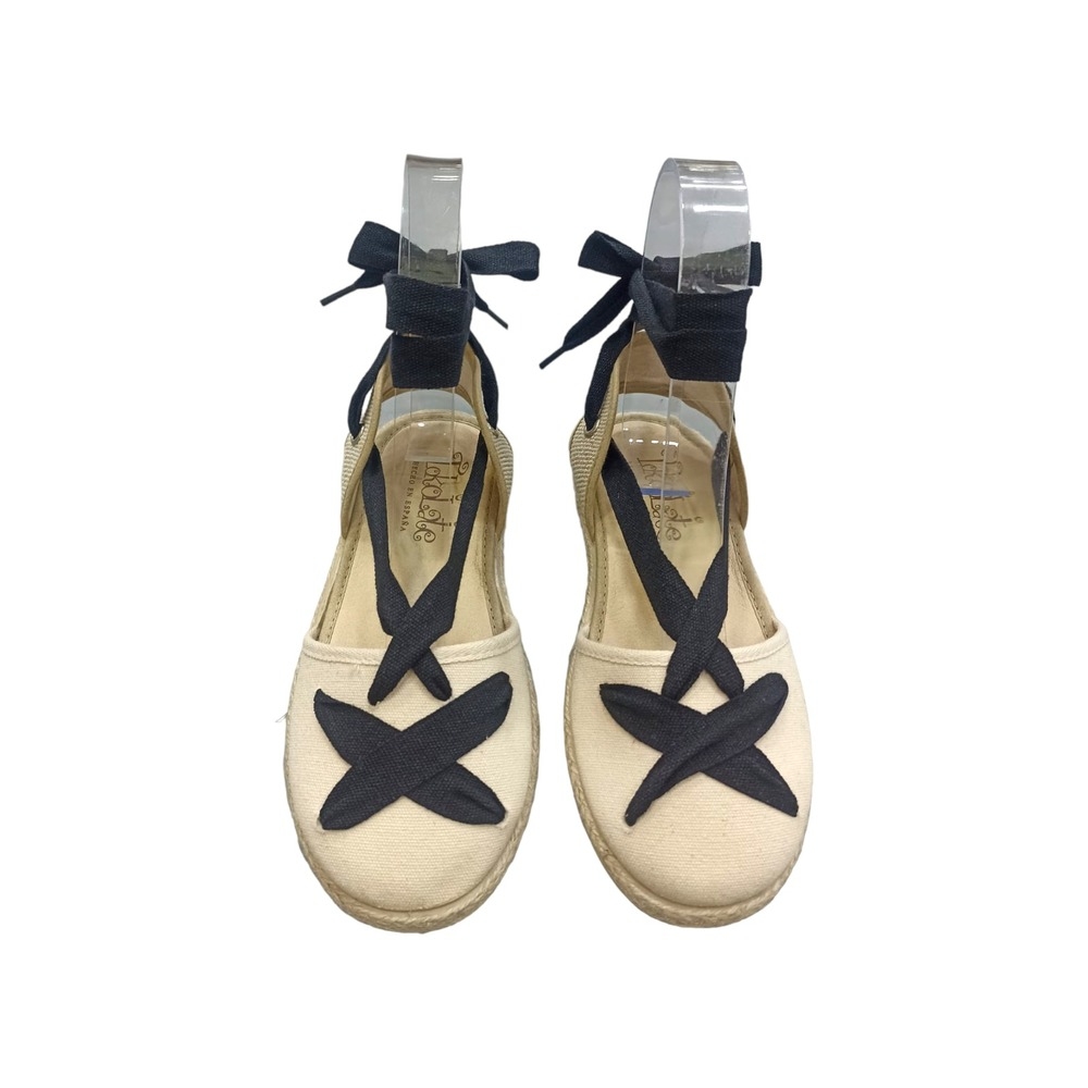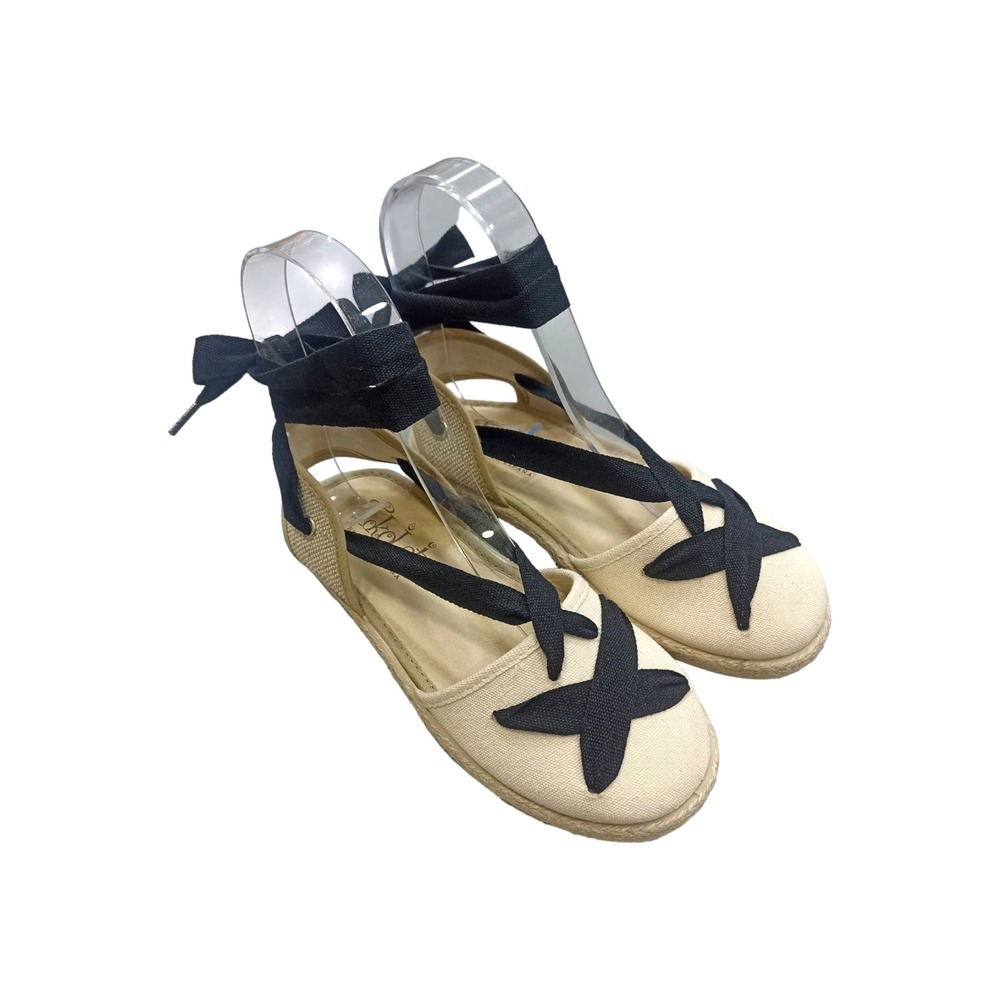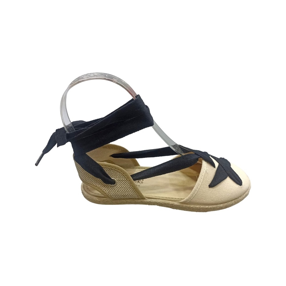 Valenciana de esparto color beig combinada con lazada. Cierre con cuerdas de color negro cruzadas. Suela flexible y antideslizante.