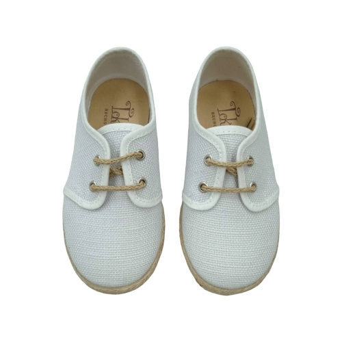 Buche en tejido lino blanco con cordones de rafia. Suela de caucho natural antideslizante para mayor comodidad al caminar con cerco de yute. Fabricado 100% en España y con productos naturales de alta calidad para garantizar transpiración y flexibilidad.