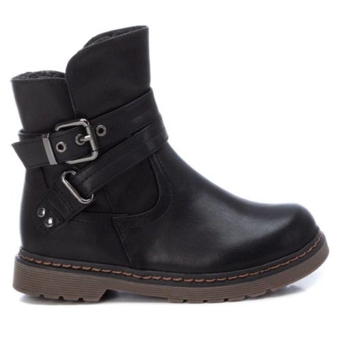 Botín de niña de la marca Xti Kids. Fabricado en material que imita la piel. Cierre de cremallera con hebillas decorativas rodeando el botín. Gruesa suela rallada de goma antideslizante. Este modelo ha obtenido el certificado vegano por la organización mundial PETA (Organización de los derechos de los animales).