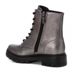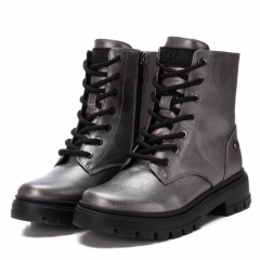 Botín de niña, de la marca Xti Kids. Fabricado en material metalizado que imita a la piel. Cordones negros regulables para un mejor ajuste. Cierre mediante cremallera interior. Gruesa suela de goma antideslizante. Este modelo ha obtenido el certificado vegano por la organización mundial PETA (Organización de los derechos de los animales).