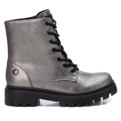 Botín de niña, de la marca Xti Kids. Fabricado en material metalizado que imita a la piel. Cordones negros regulables para un mejor ajuste. Cierre mediante cremallera interior. Gruesa suela de goma antideslizante. Este modelo ha obtenido el certificado vegano por la organización mundial PETA (Organización de los derechos de los animales).