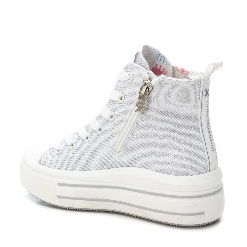 Zapatilla de niña, de la marca Xti Kids. Fabricada en lona metalizada. Cierre cremallera lateral y cordones ajustables. Imprescindible de esta temporada. Tirador trasero para facilitar la puesta. Piso con volumen, cómoda planta y gruesa suela de goma antideslizante. Este modelo ha obtenido el certificado vegano por la organización mundial PETA (Organización de los derechos de los animales).